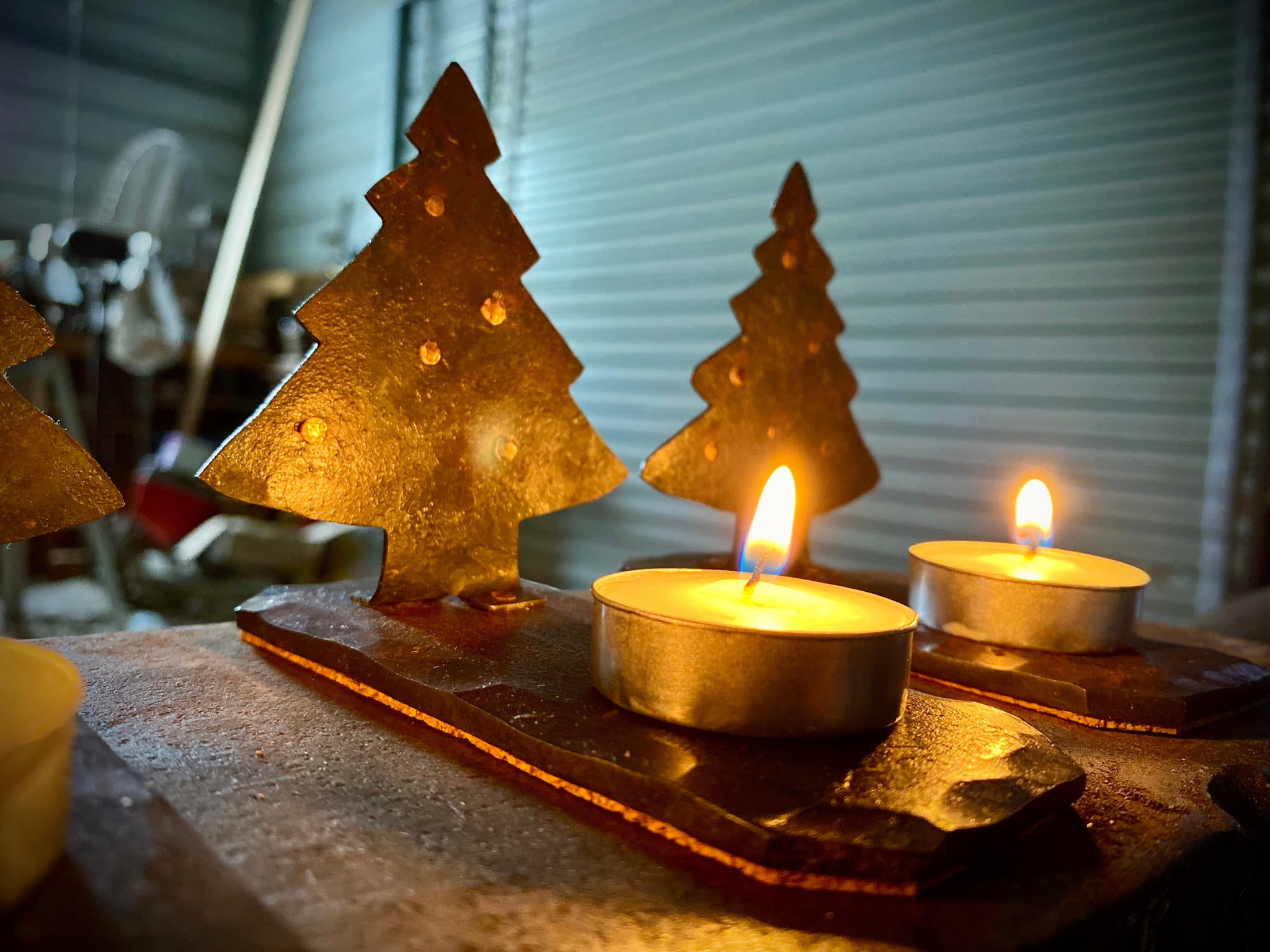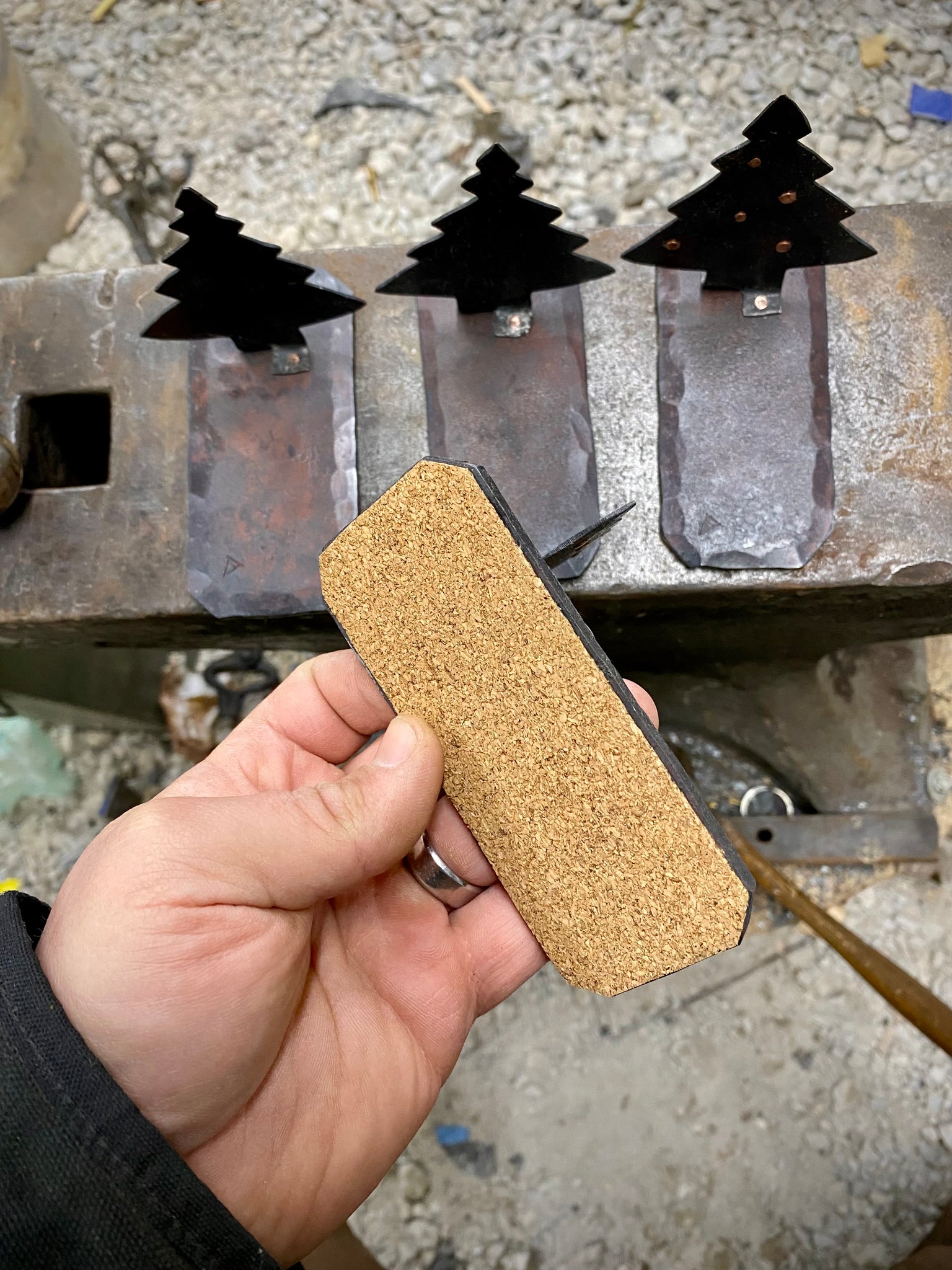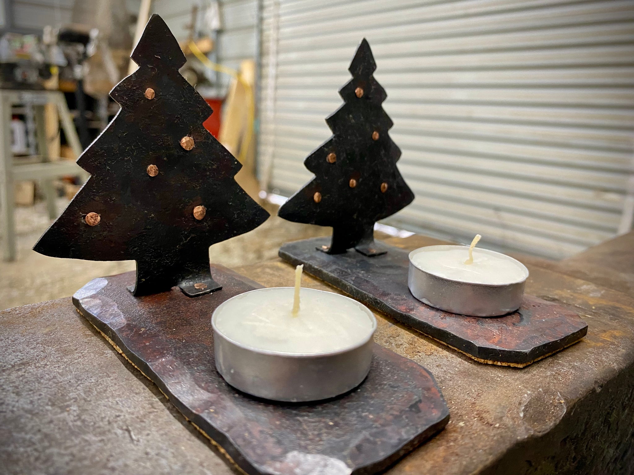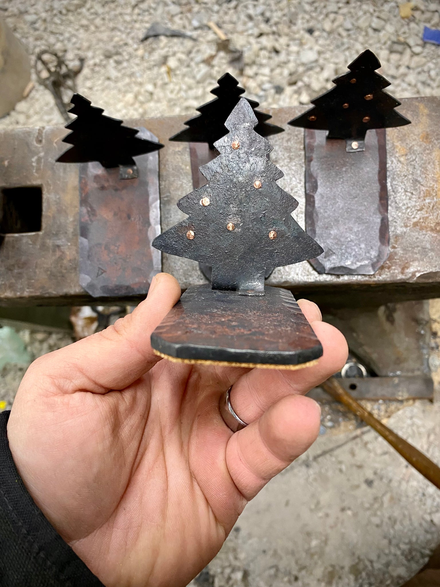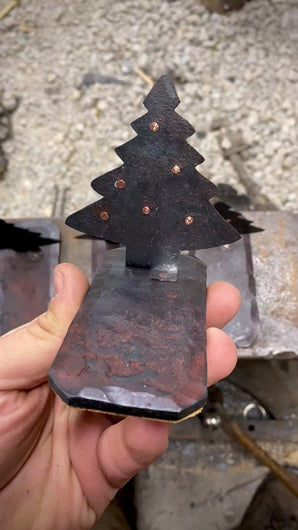 All hand forged and handmade this Christmas tree sculpture is made of forged steel, all pieces are held together using copper rivets, no welding at all! The Christmas tree feature copper studs that I peen in place and act as ornaments on the tree.