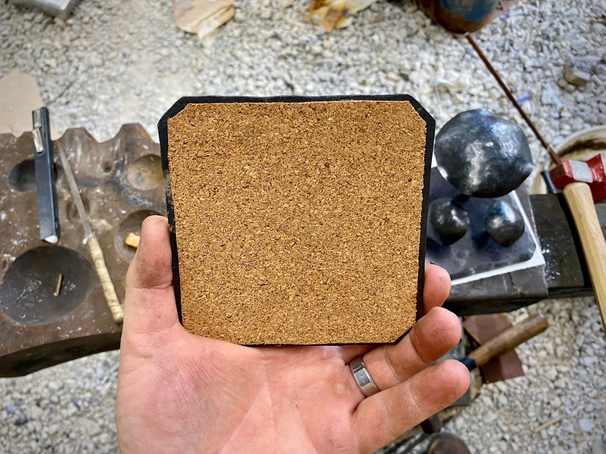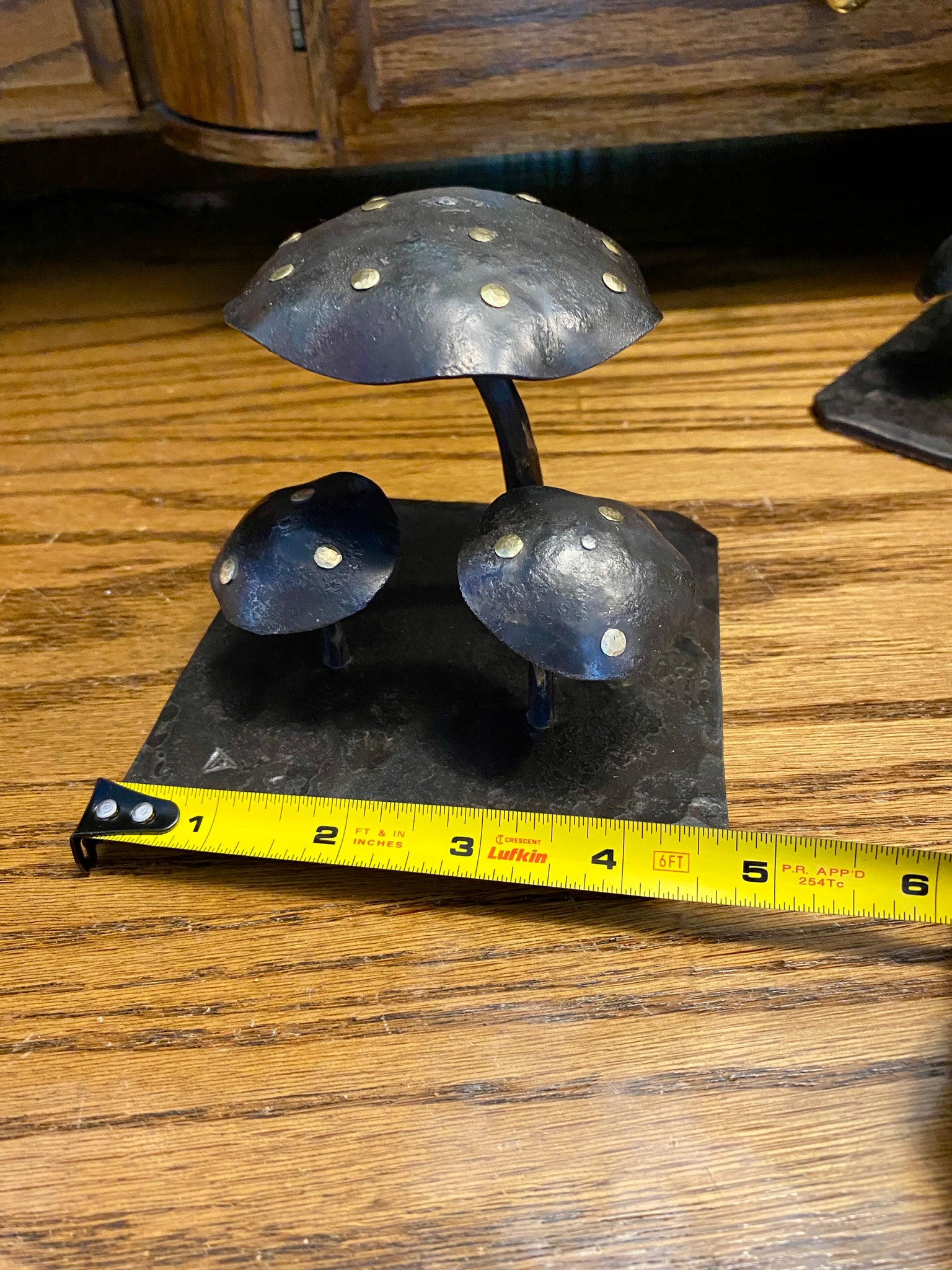 All hand forged and handmade this mushroom sculpture is made of forged steel, all pieces are held together using a traditional blacksmith technique called tenons, no welding at all! The mushroom caps feature brass studs that I make myself and peen in place.