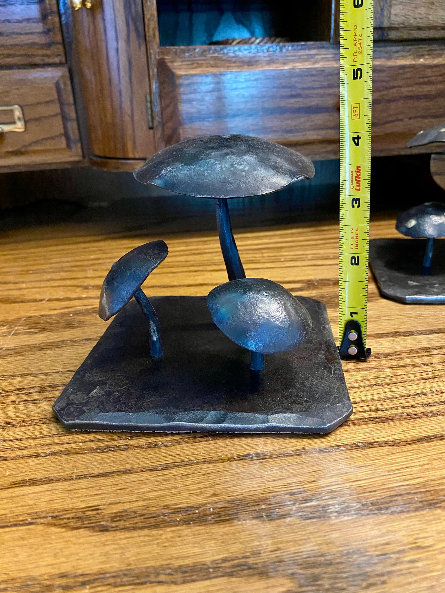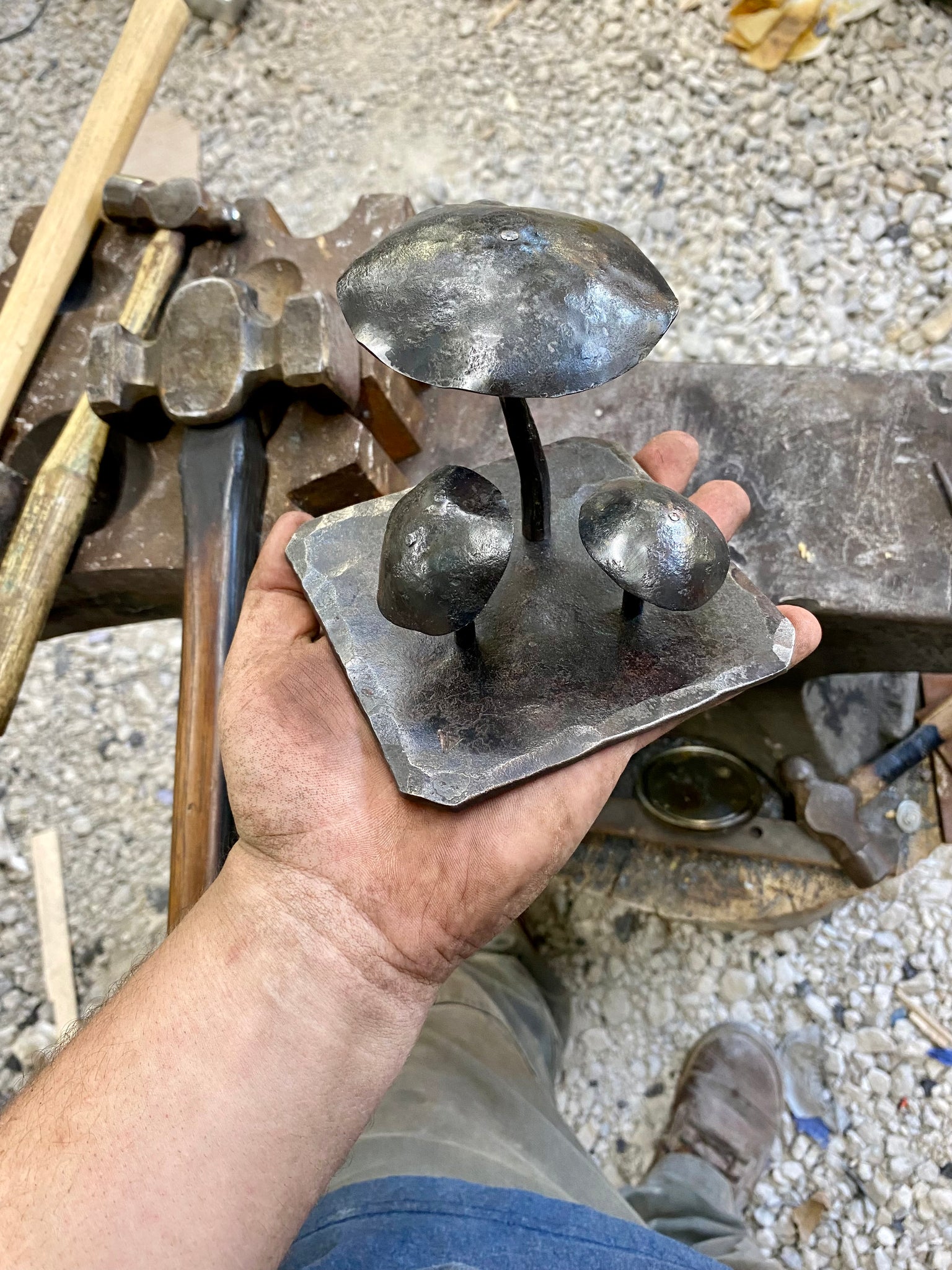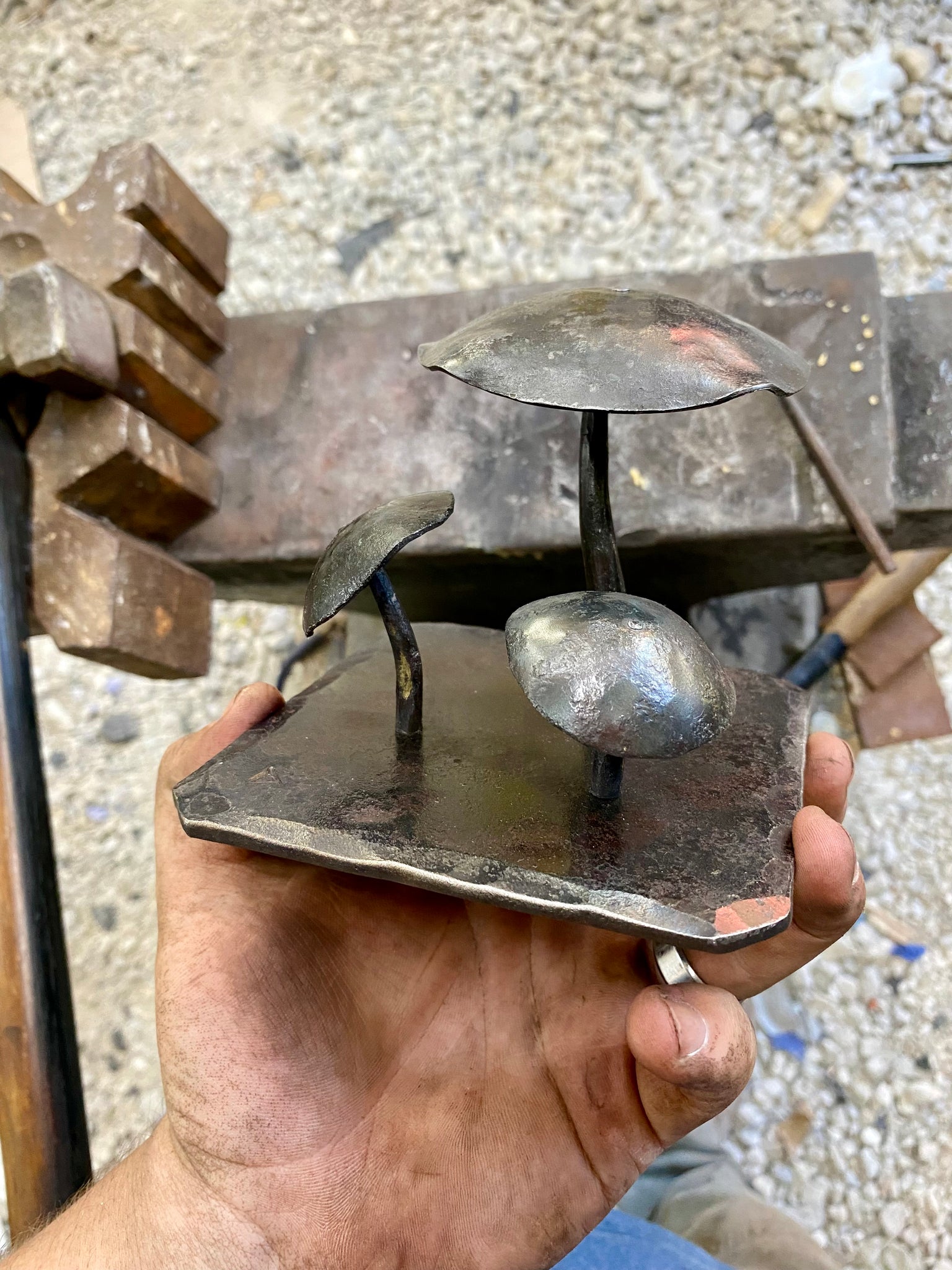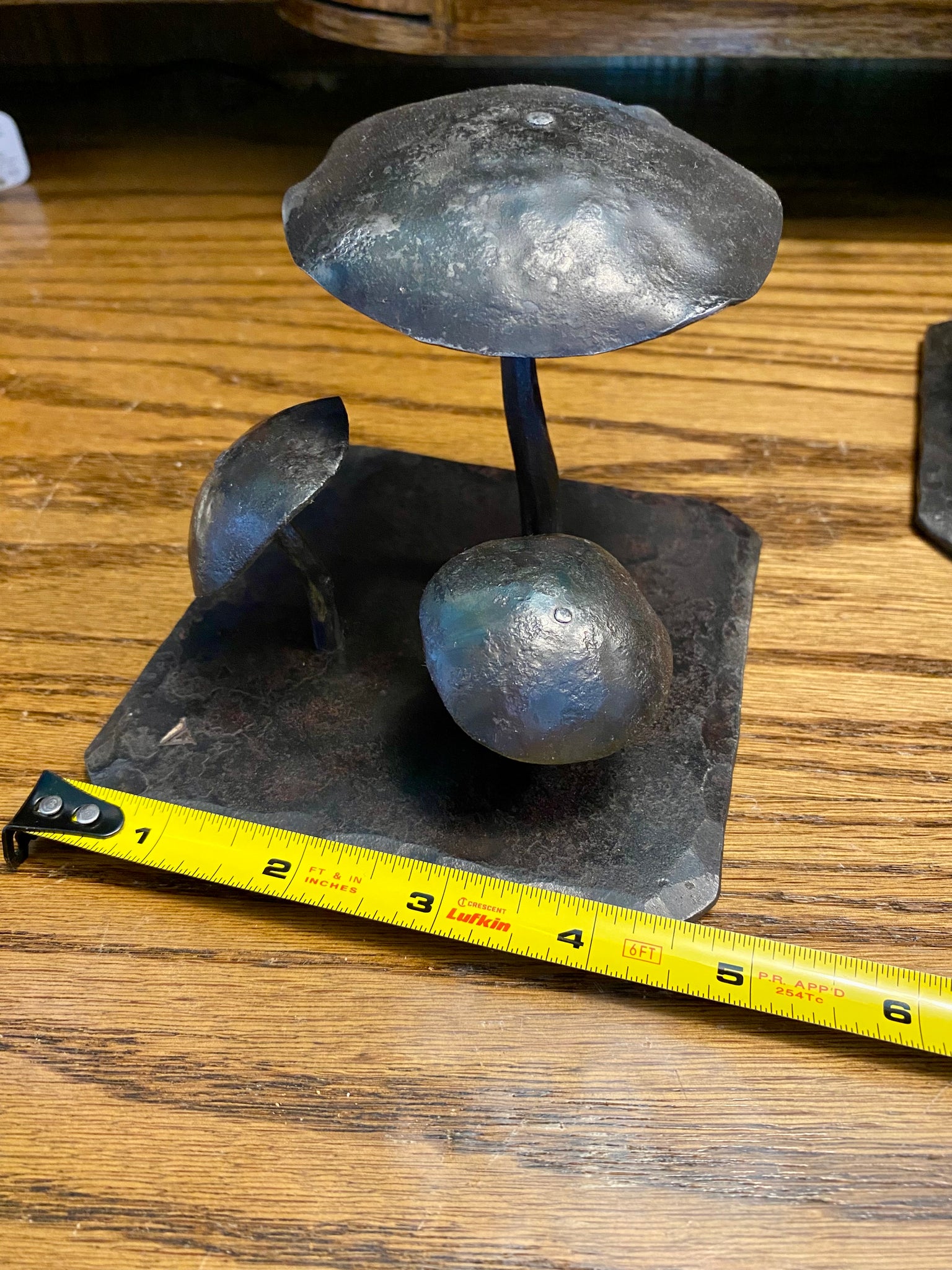 All hand forged and handmade this mushroom sculpture is made of forged steel, all pieces are held together using a traditional blacksmith technique called tenons, no welding at all!