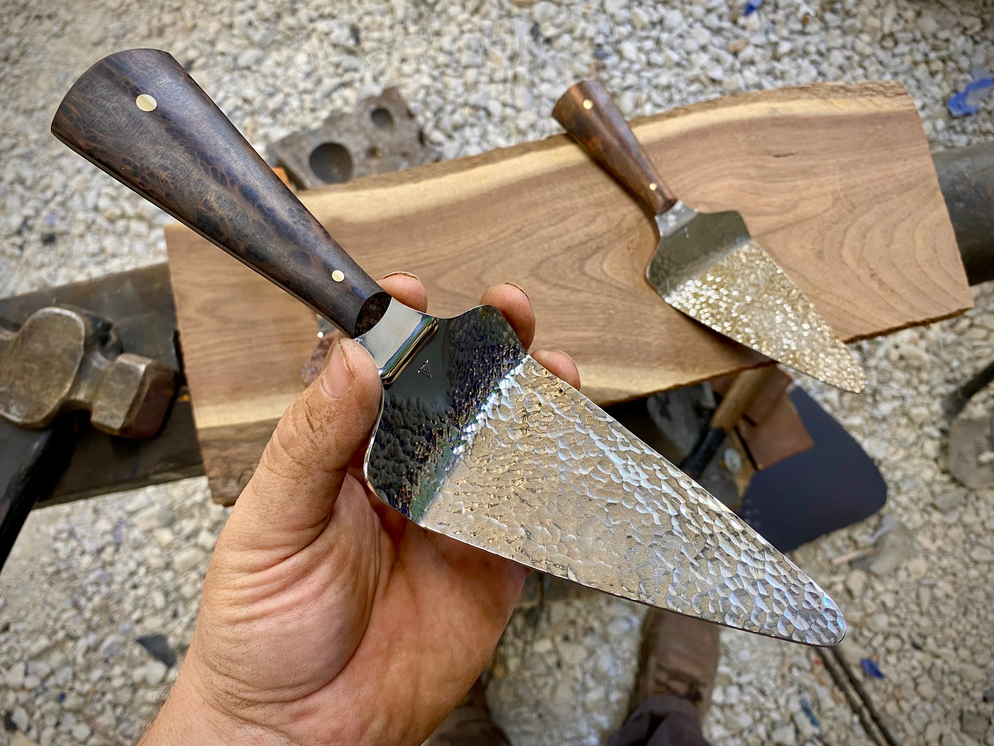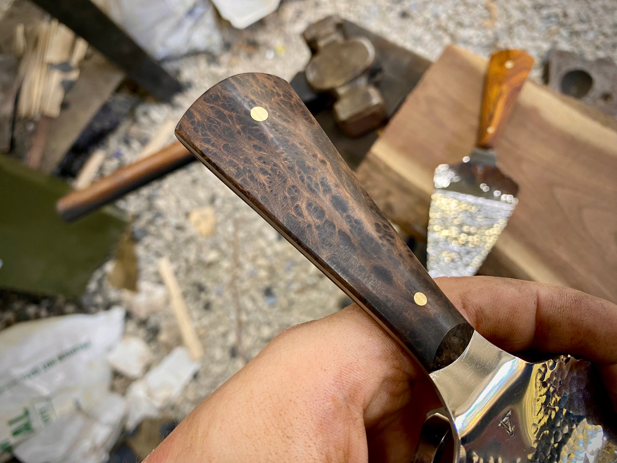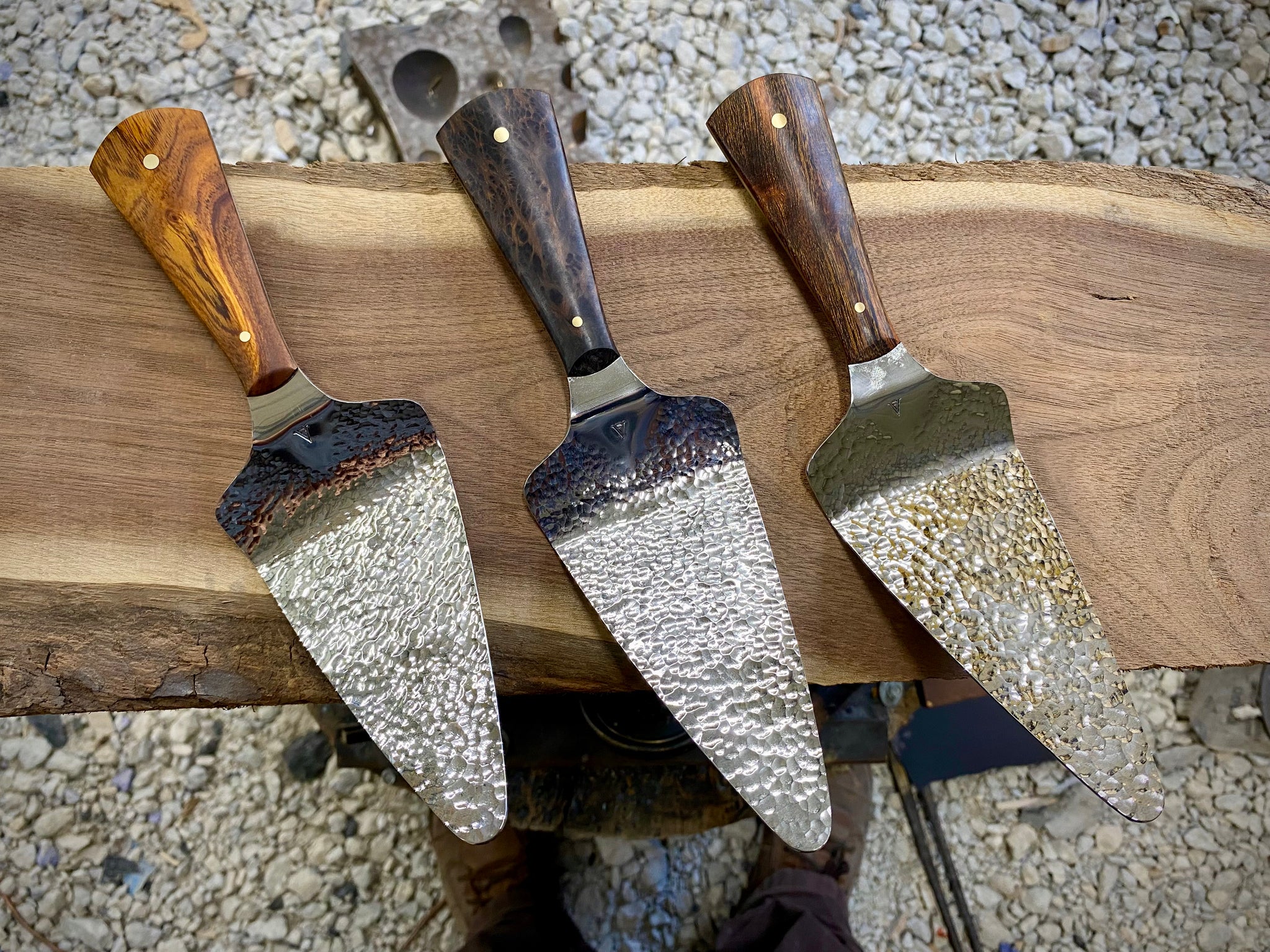 Made out of stainless steel this pie server has a hand hammered finish… meaning each and every rounded spot was an individual blow from my hammer. It has a very nice stabilized redwood burl handle with brass pins.