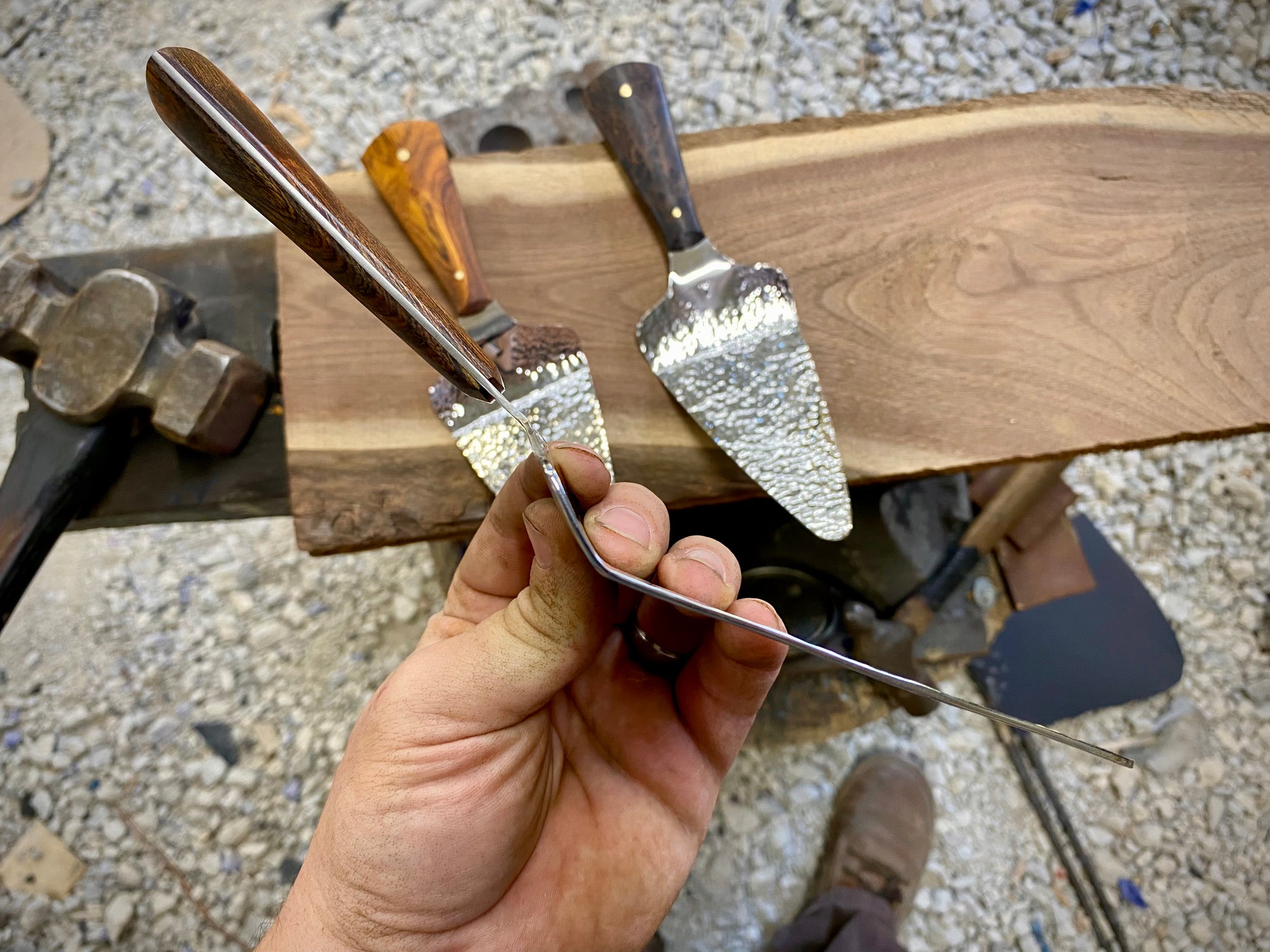 Made out of stainless steel this pie server has a hand hammered finish… meaning each and every rounded spot was an individual blow from my hammer. It has a very nice desert ironwood handle with brass pins.