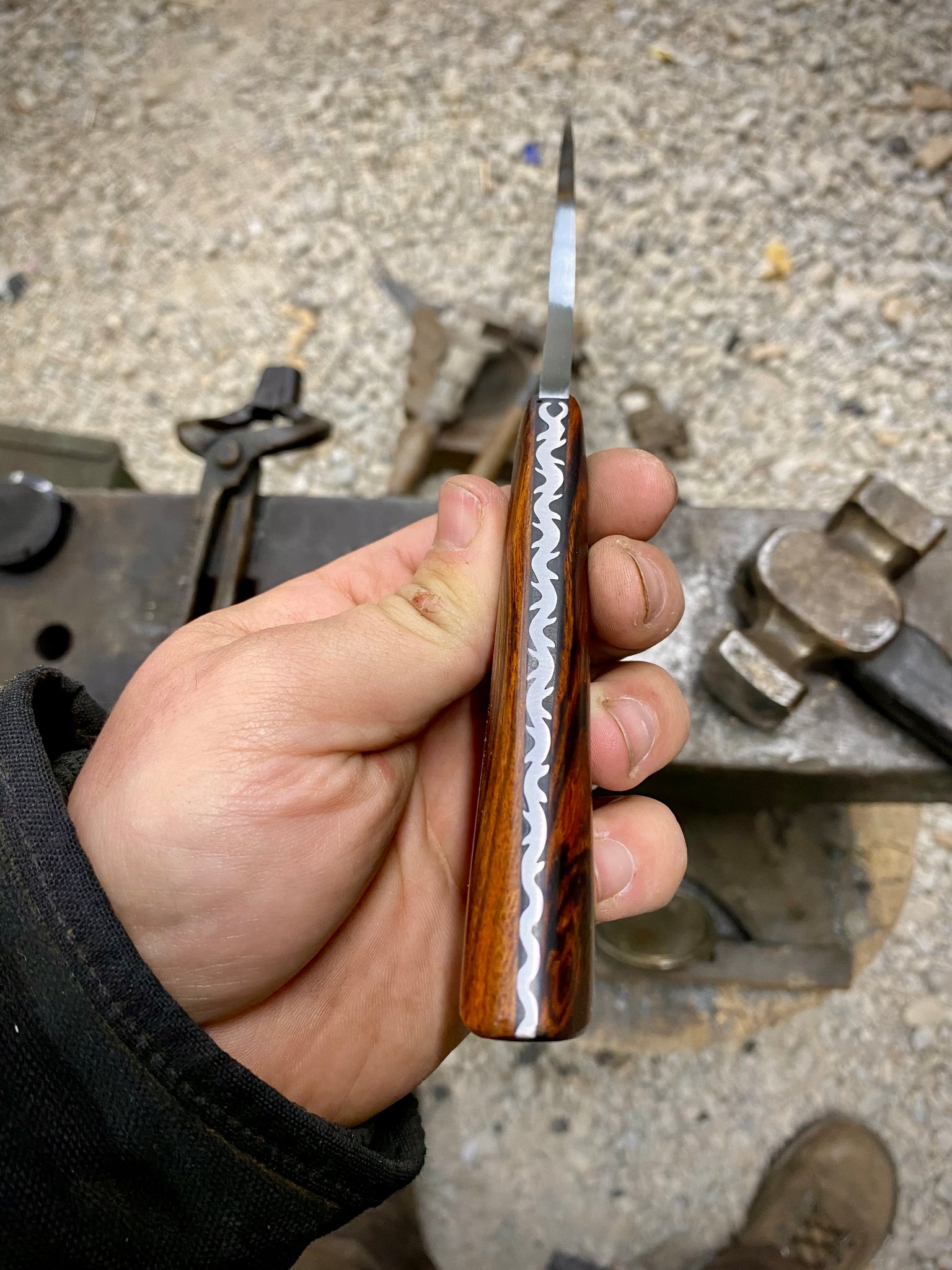 This Valiant Camp knife is hand forged out of 15N20 high carbon steel, features a very nice desert ironwood handle with brass pins.